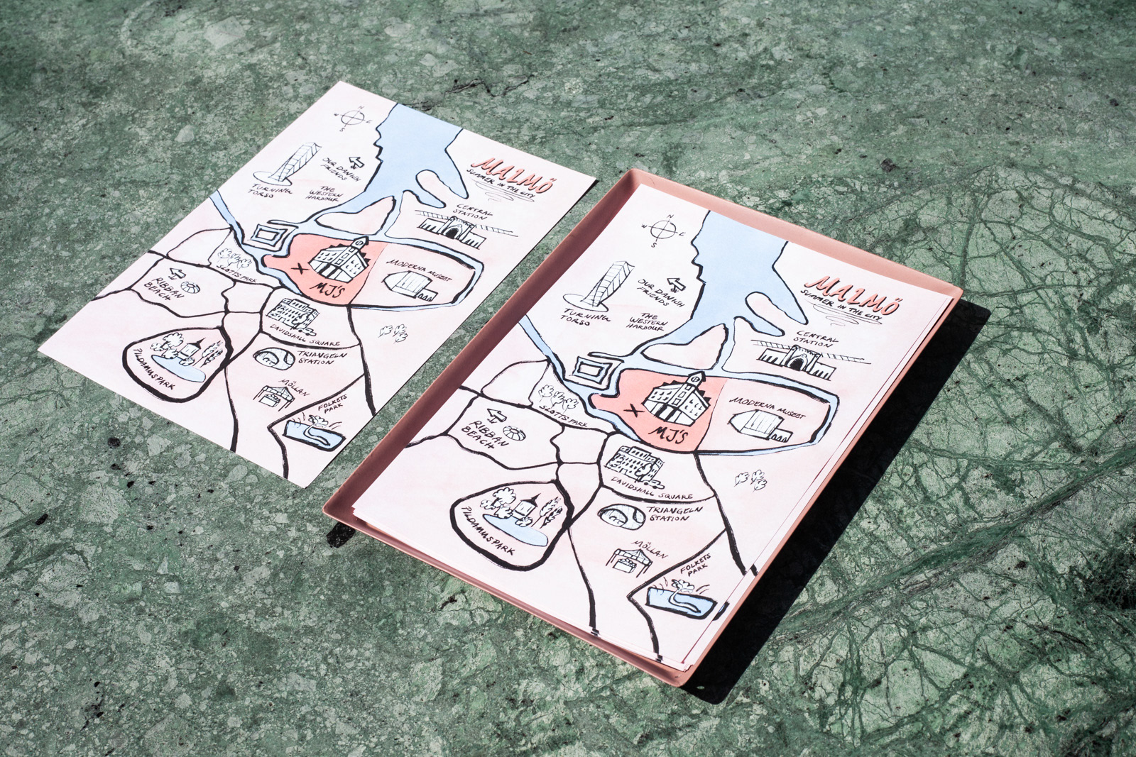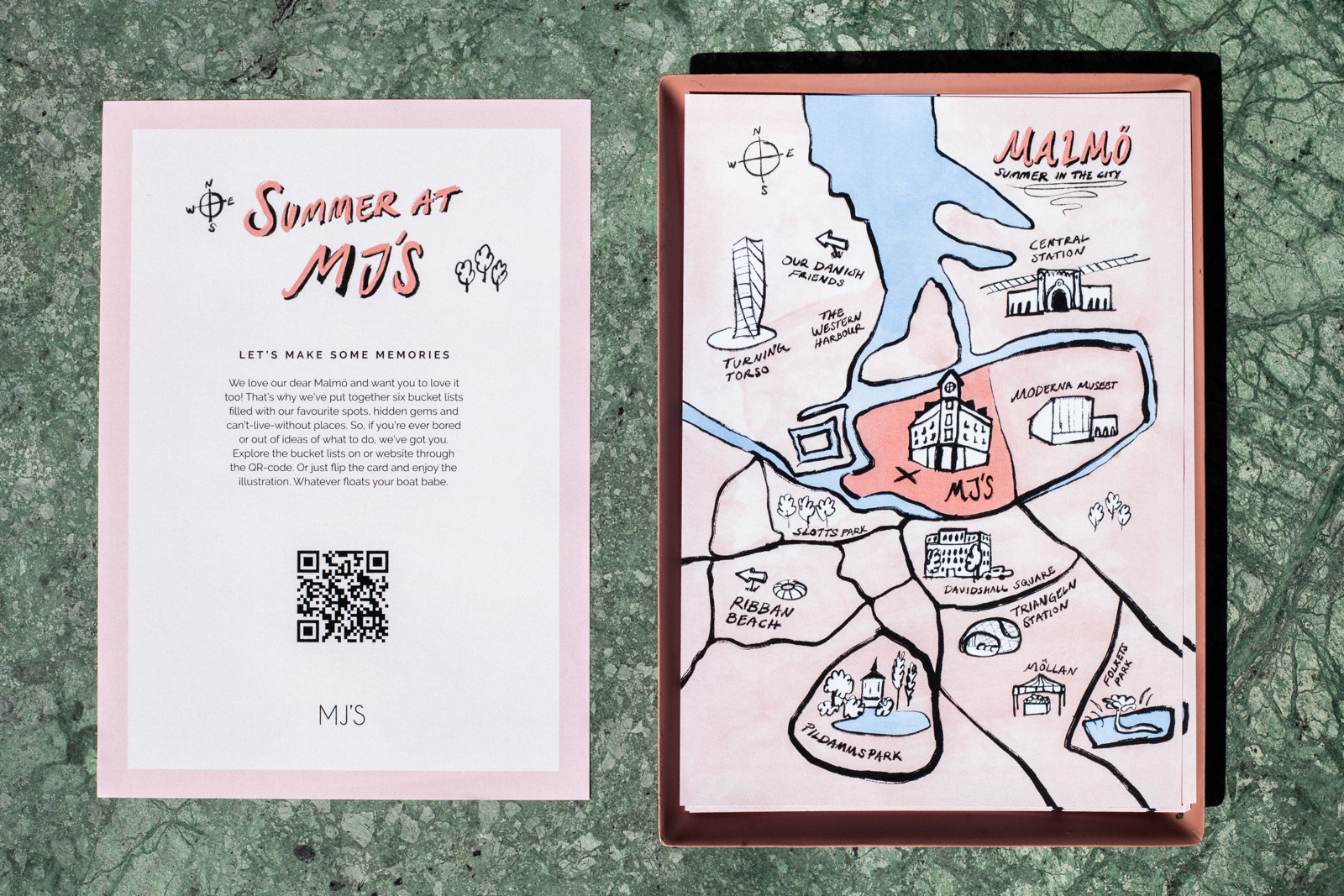 MJ'S summer map was created to inform hotel guests about Malmö and some of the places to be and activities to do. The illustration is pink and playful to match MJ'S tonality. On the back of the printed map, a QR-code leads to a landing page with bucket lists of MJ'S recommended summer activities. My work entailed creating the illustration, design and copy of the printed material and the website.
